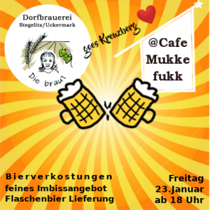 Uckermark-Berlin, zweite Runde! Am 23.Januar könt ihr wieder unser Flaschenbier zur Abholung nach Kreuzberg bestellen. Plus Bier-Tasting mit exklusiven Snacks zu den Biersorten aus der legendären Küche des Cafe Mukkefukk ! Bestellungen, Anmeldungen, Infos unter sarah@fettecke.de